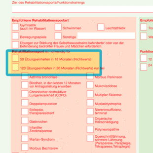 Unter „Empfohlene Rehabilitationssportart“ bzw. unter „Empfohlene Funktionstrainingsarten“ definiert der Arzt, welche genau Form der Maßnahme notwendig ist. Des Weiteren wird angegeben, wie umfangreich die Maßnahme sein soll. In der Regel gibt es 50 Übungseinheiten in 18 Monaten (bei Rehasport) bzw. 12 Monate Funktionstraining. Abweichungen können ebenfalls empfohlen werden; hierzu dann in der Regel auch die betreffende Krankheit ankreuzen. Auf Seite 2 können oben zudem Empfehlungen für Rehasport in Herzgruppen genannt werden.